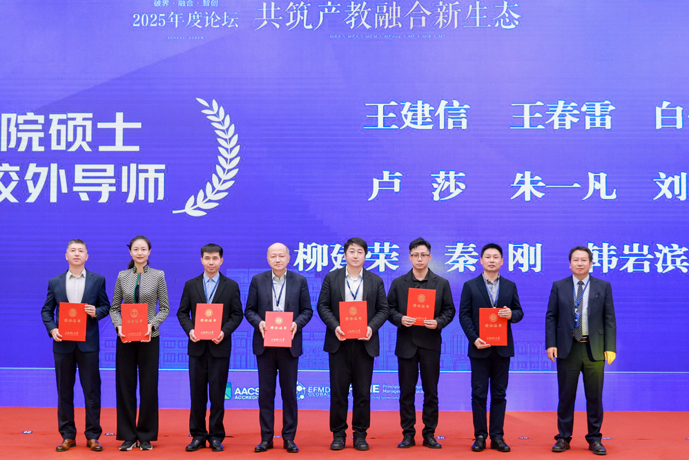在与会嘉宾见证下,奇迹点医疗科技集团有限公司、上海外高桥南丰科创智汇谷、原能细胞科技集团有限公司、上海林清轩化妆品集团股份有限公司、温州生产力促进中心、青岛国际枢纽港校地协同创新基地、陆家嘴集团陆创AI加速器、河南教育人才学会成为新一批产教融合实践基地并正式揭牌。朱一凡、白俊平等58人受聘为管理学院新任校外导师。